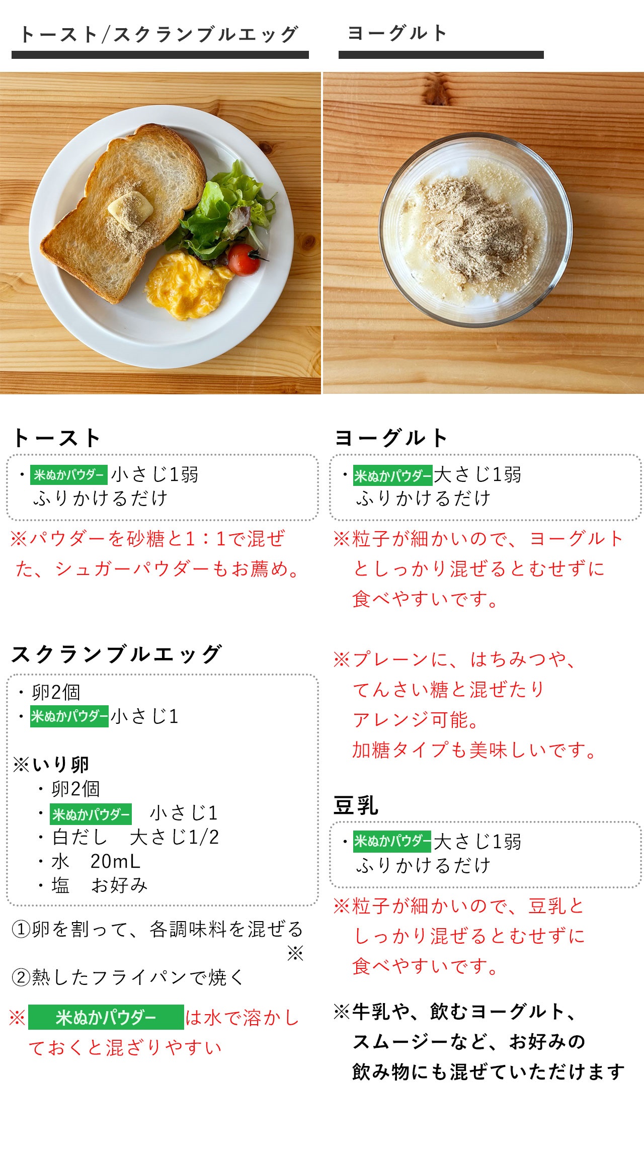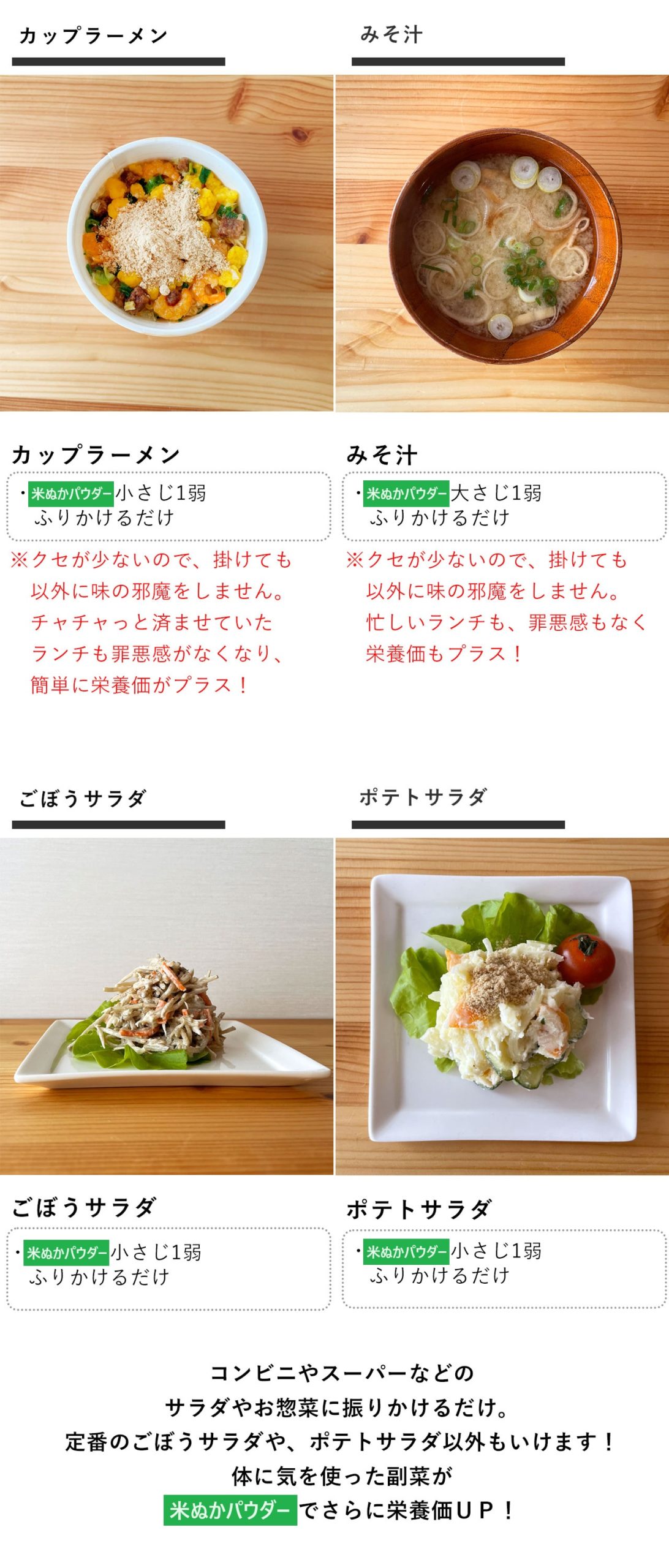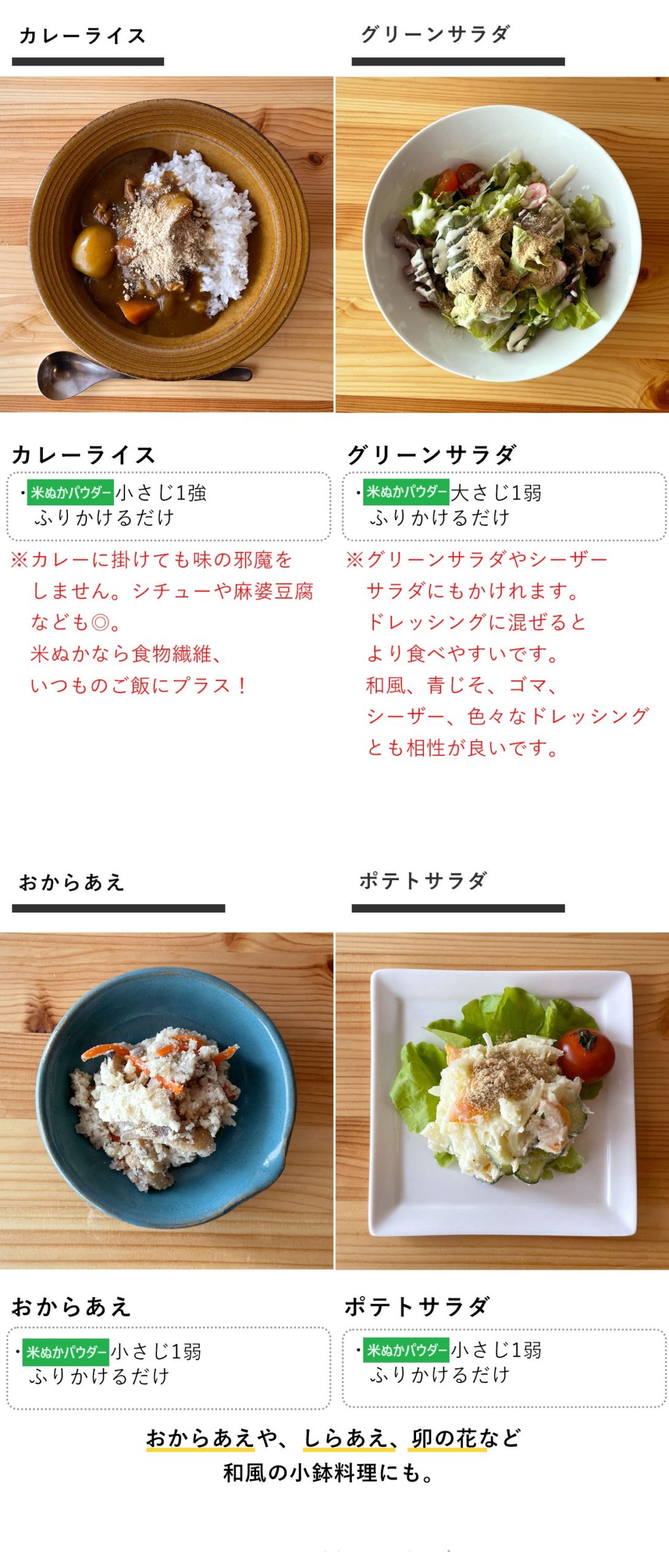 食べる米ぬかパウダーを使ったおすすめレシピをご紹介します。当社のパウダーはクセが少ないのでどんな料理にも相性が良いのですが、特に食べやすいレシピをご紹介させていただきます。今後も新たなレシピを追加していきますので、お楽しみに!